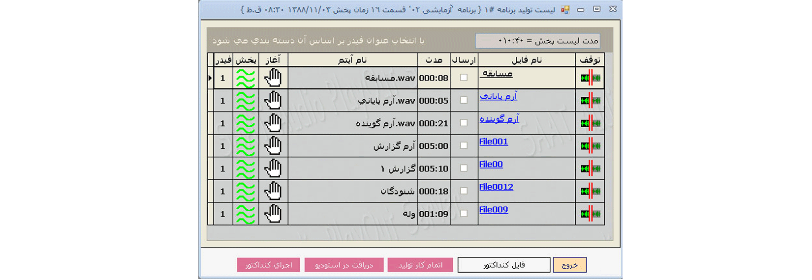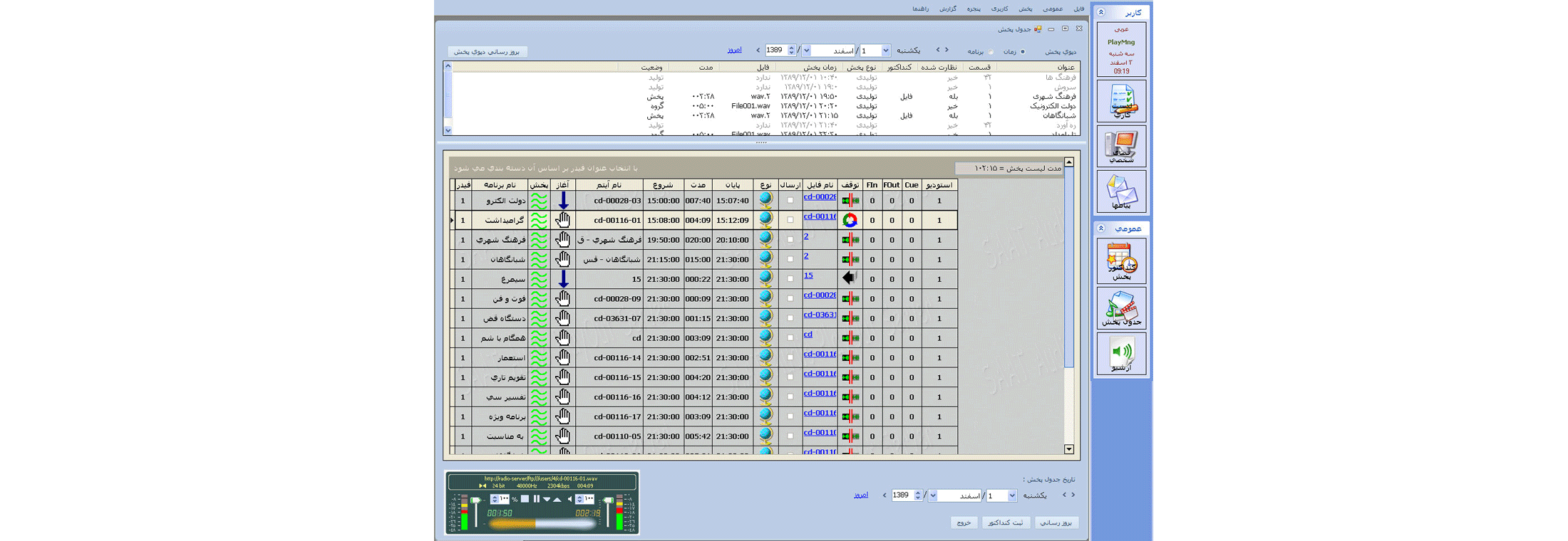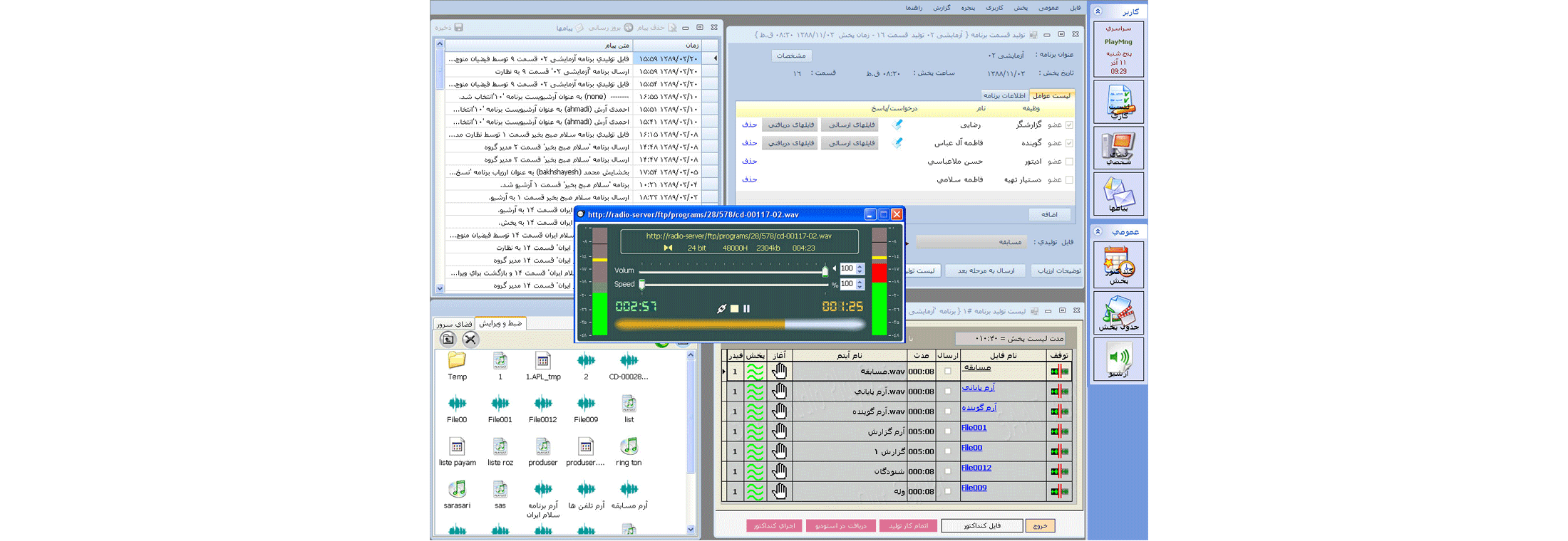 This system connects to archive and provides access to both on-line and off-line archived resources and enables users to produce and prepare playlists and even edit audio files, with a high flexibility. Finally, it sends files to on-air studio and also provides on-air management.