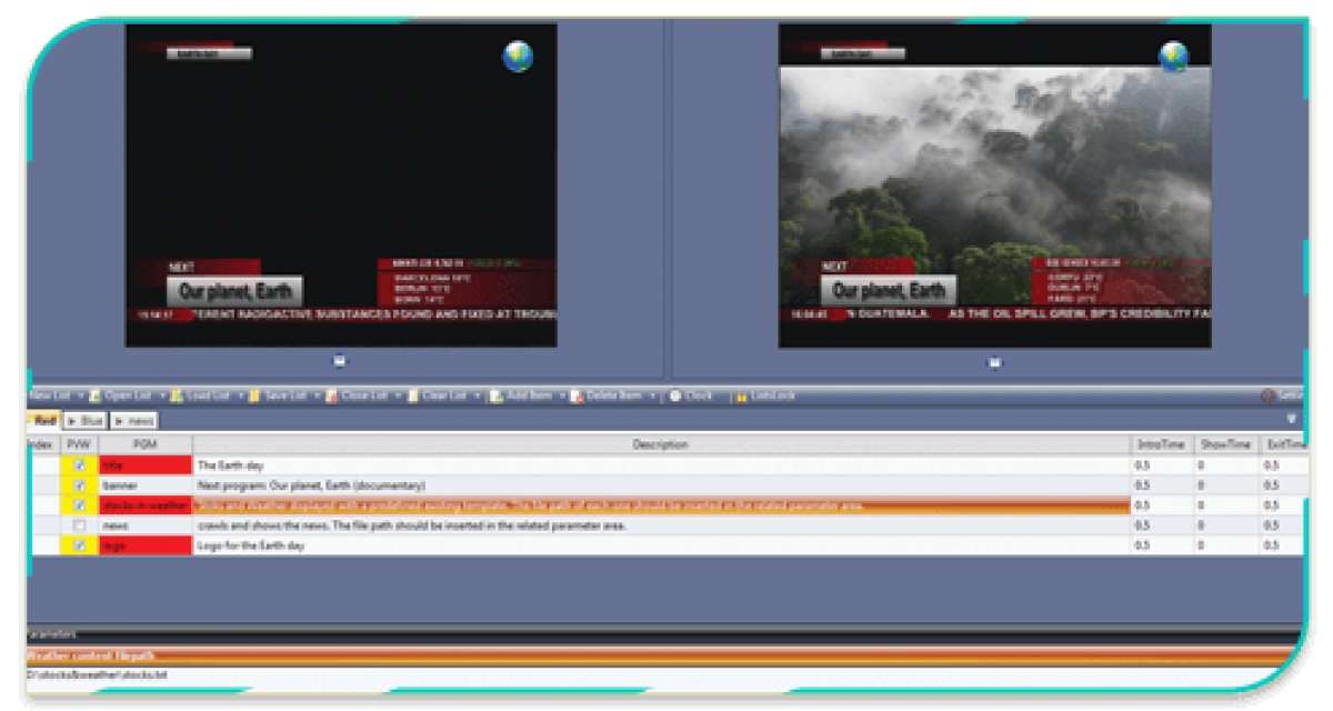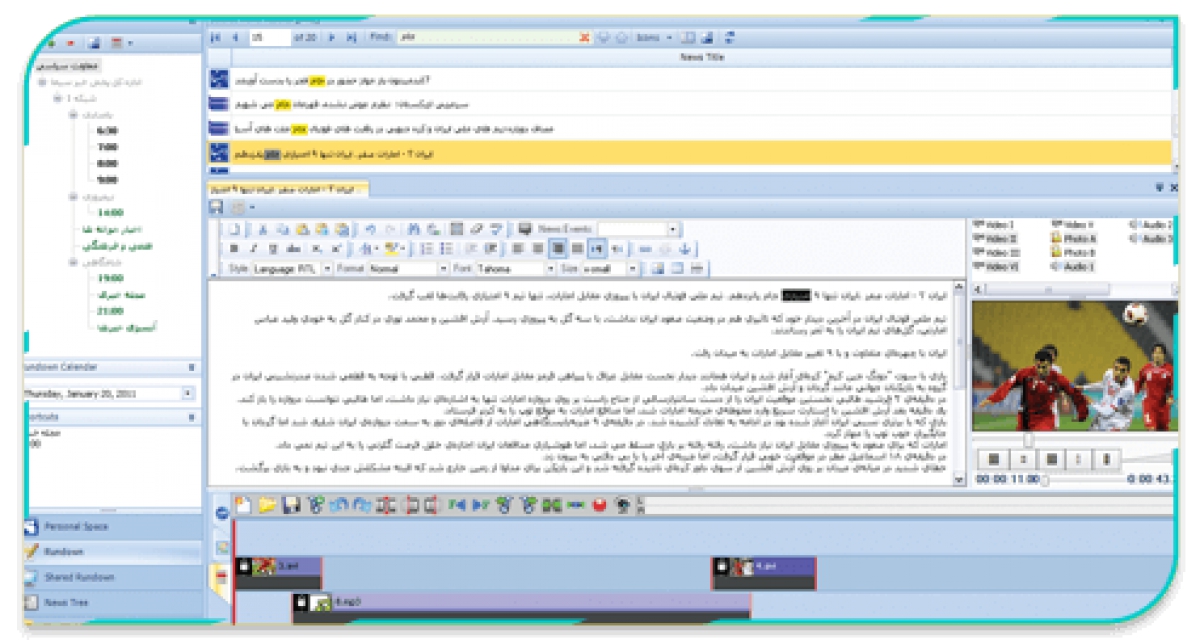 All produced scripts alongside the attached movies are placed in the playout Rundown, which includes all the ready stories respecting their orders. Each news story consists of the news script and attached sounds, movies, graphics, and their orders for playing. Related studio devices such as teleprompter, CG, and playout automatically receive the playlist with the recent news editions. The Rundown is editable and can be upgraded at any step of broadcast and before starting the playback of each item.