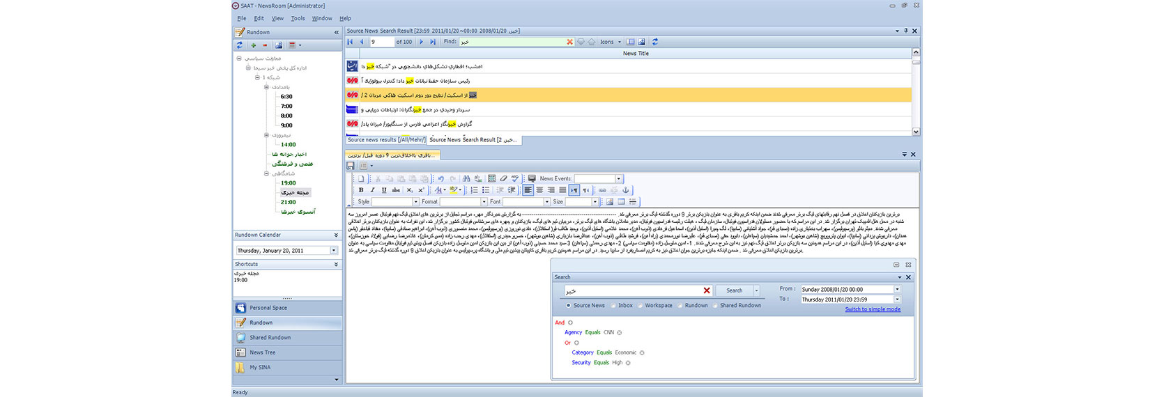 The main purpose of a news agency is to produce and publish news in the least time in competition with the other news agencies. SINA newsroom software has accomplished this dream and now is available for news teams as a reliable and efficient tool to help producers do their works quickly and with the least expenses. This is a result of designing the system while having news directors along and respecting their needs.