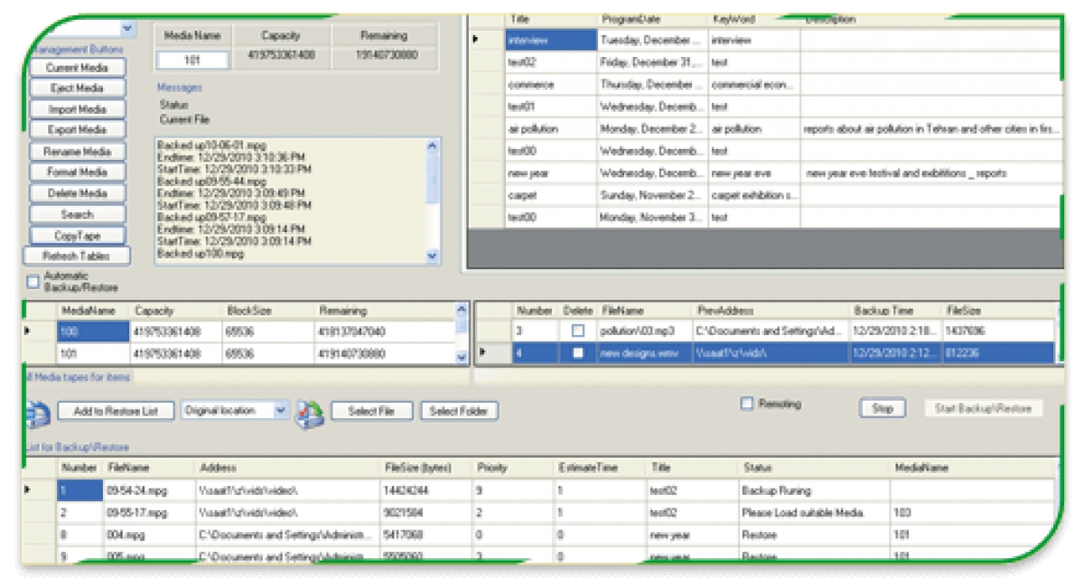 Regarding the requirements of a documentation center, how the archive is used, and how often it is referred to, an appropriate solution should be offered. Among different currently available storages to keep archived materials and information in, users can select any storage from a usual computer hard disk to high-capacity standalone storages with a capacity of tens of Terabytes able to keep thousands of hours of videos or use centralized SAN, NAS, and DAS mass storages or digital magnetic tapes.