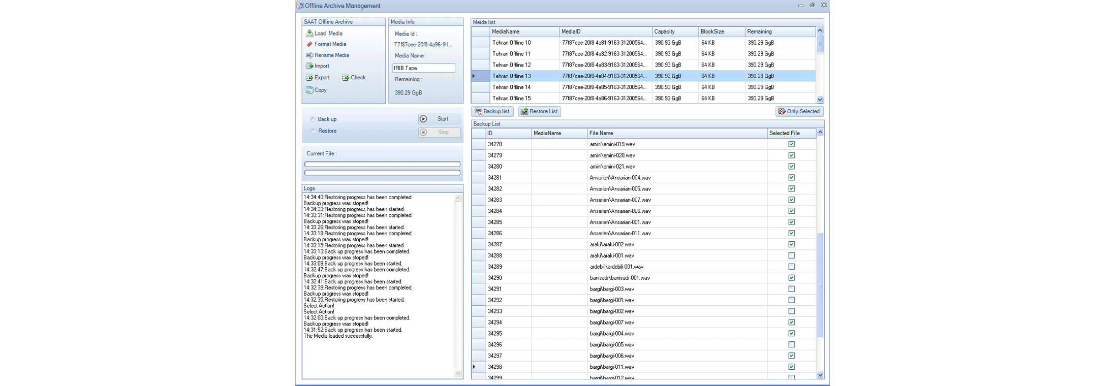 SAMA Backup is designed to help to save a backup of media files on digital magnetic tapes. It provides a user-friendly environment with proper facilities to manage backup tapes. Users can view the metadata of archive objects on tapes such as title, keywords, description, and date before loading the tapes. SAMA Backup can be integrated with SAMA Archive, and in this case, all backup and restore operations can be directly done via the SAMA Archive interface.